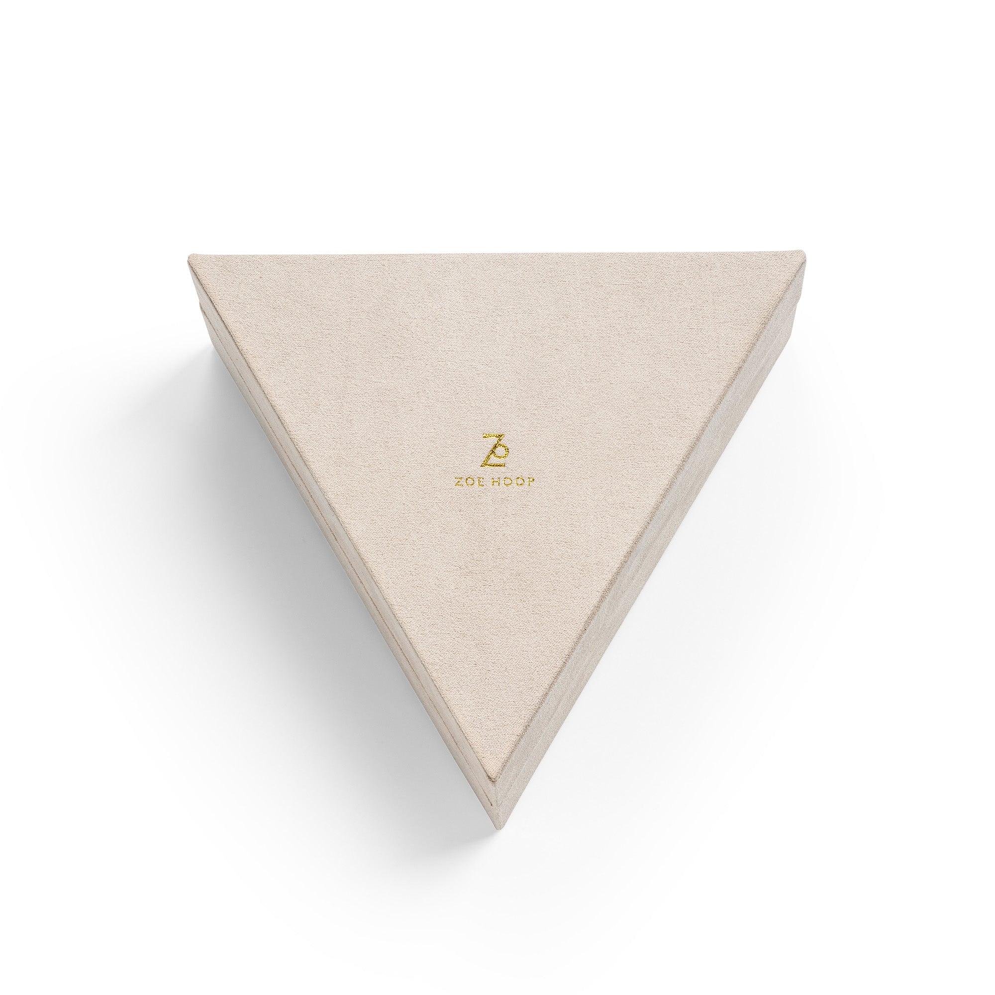 • Triangular design with gold-embossed ZOE HOOP logo on the lid