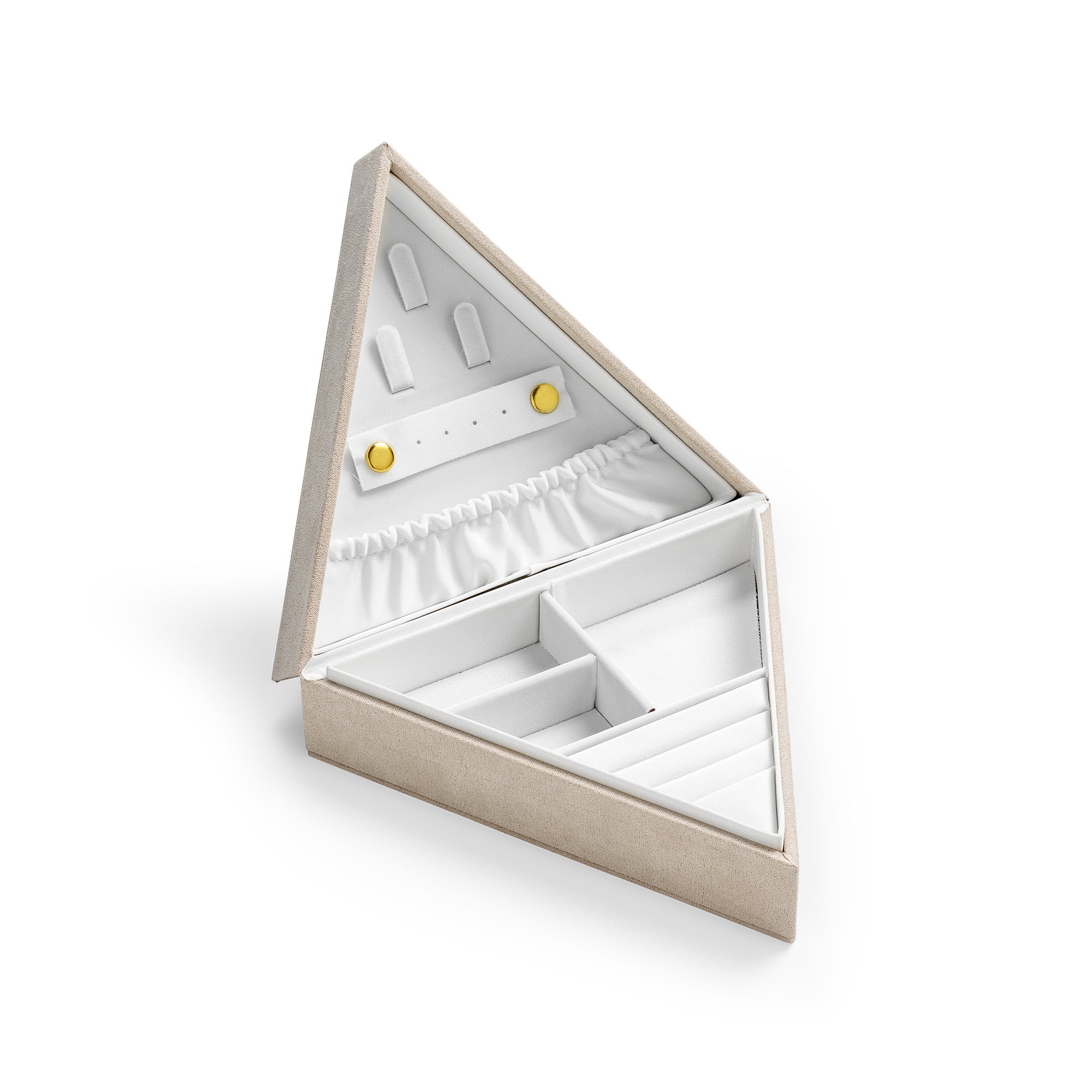 The box is wrapped in soft warm-gray velvet and lined with pearl-white satin smooth as silk. Its triangular shape reflects the Holy Trinity — the divine unity that holds our lives in His strong and gracious hand.